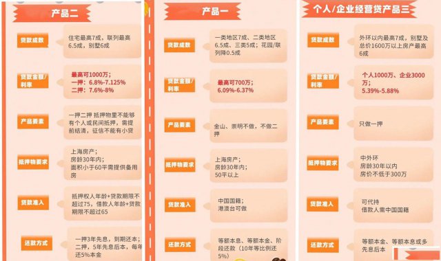 1.银行房产抵押上海市住宅、别墅、商铺、写字楼、厂房一抵,二抵,月息0.5%,分期1-20年,等额本息/先息后本,额度100万-3000万。