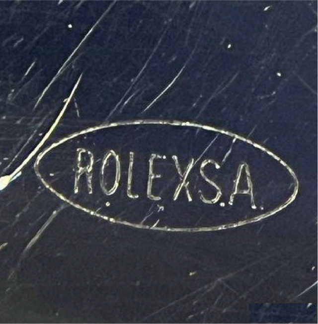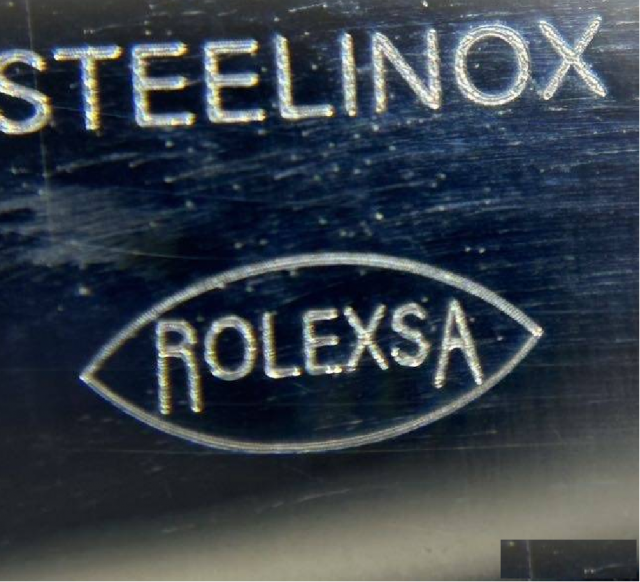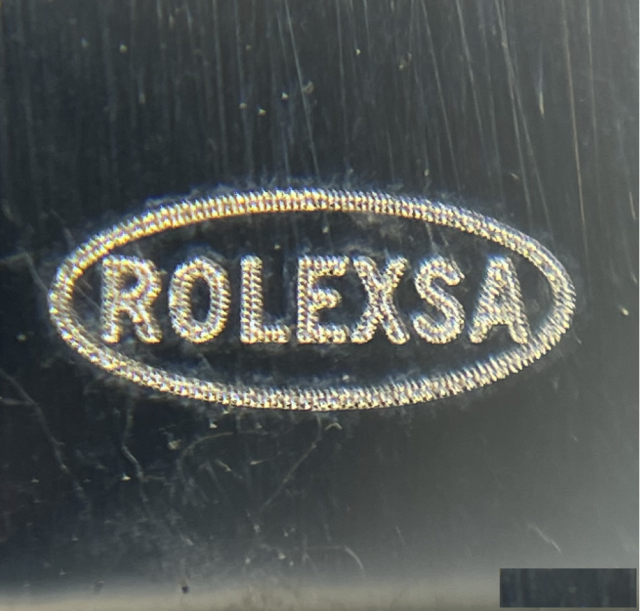 劳力士近代款的表扣,橄榄型厂标可以作为辅助鉴定点,劳力士厂标下方共有4个小圆点,字母O下方,EX下方的为防伪点,S后面的为英文的句号,A后面的点为英文公司的缩写。