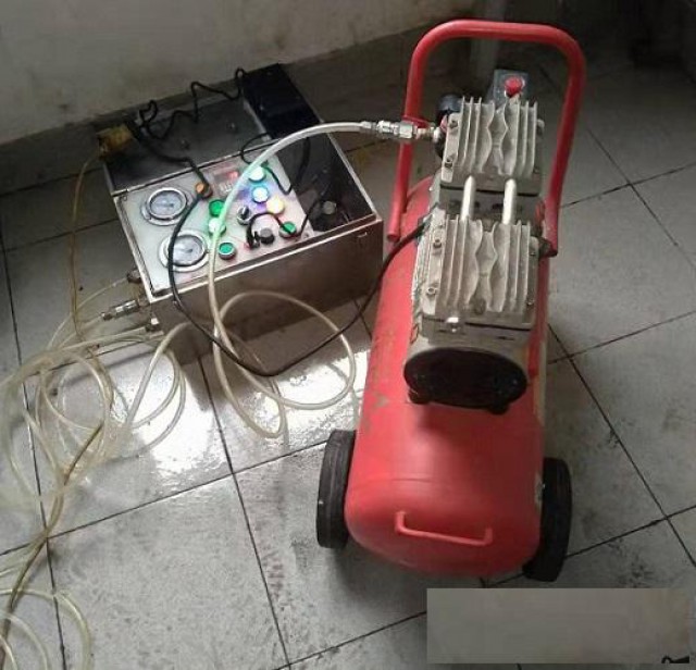 5、浸泡三十分钟后,将总水阀开启,然后再开启气泵和脉冲进行对水管内壁冲洗,顺序打开每个水龙头来冲洗,每组冲洗一刻钟左右。冲洗热水管要有进水口,须要连接自来水或者水泵抽水完成冲洗工作。