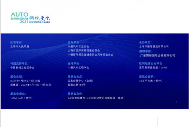 第十九届上海国际汽车工业展览会(以下简称:2021上海车展)将于2021年4月21日至28日在国家会展中心(上海)举行。”