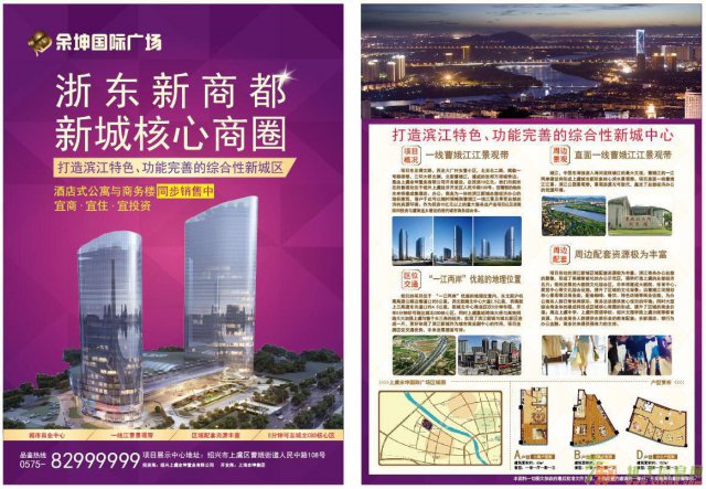 商业、120m高办公楼、180m希尔顿星级高级酒店入住组成、绍兴上虞区滨江新城地标。