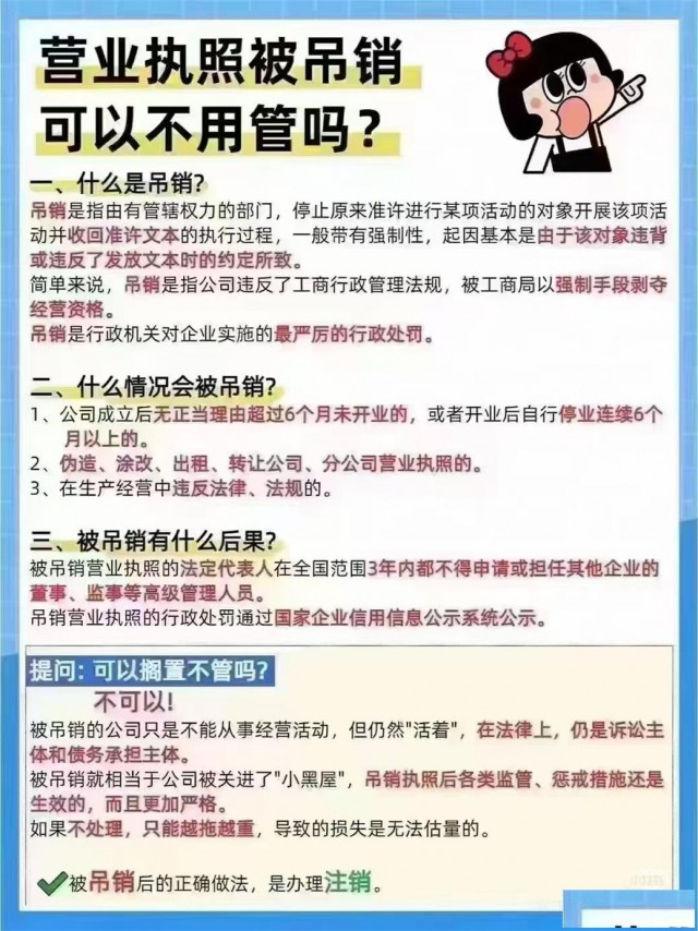 3、如果不处理,只能越拖越重,导致的损失是无法估量的。被吊销后的正确做法,是办理注销。