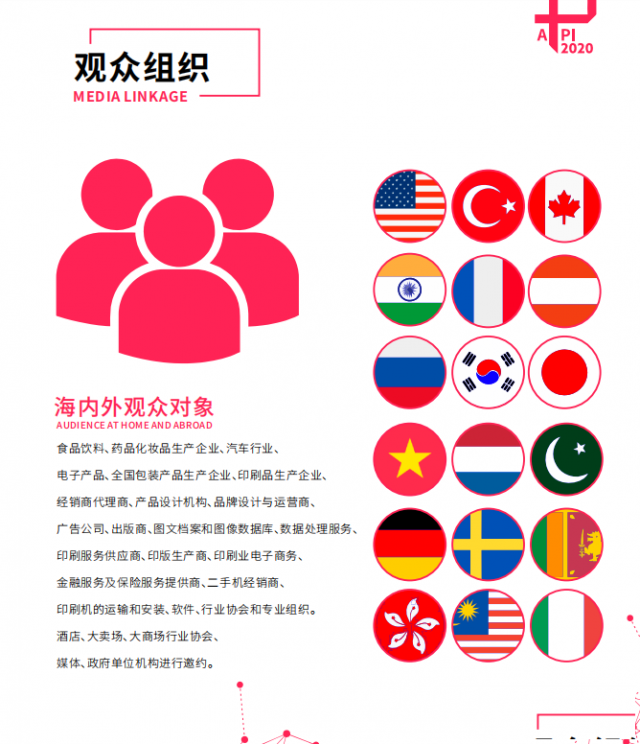 食品饮料、化妆品生产企业、汽车行业、电子产品、全国包装产品生产企业、印刷品生产企业、经销商代理商。产品设计机构、品牌设计与运营商、广告公司、出版商、图文档案和图像数据库、数据处理服务、印刷服务供应商、印版生产商、印刷业电子商务、金融服务及保险服务提供商、二手机经销商、印刷机的运输和安装、软件、行业协会和专业组织。酒店、大卖场、大商场行业协会、媒体、单位机构进行邀约。