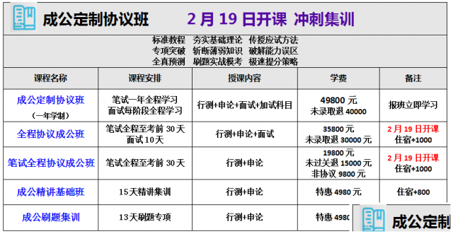 成公教育年后全程协议成公班课程,2月19日正月初八开课,包括全程笔试至考前30天和10天的面试课程,学费35800元,未录取退30000元,住宿再加1000元。