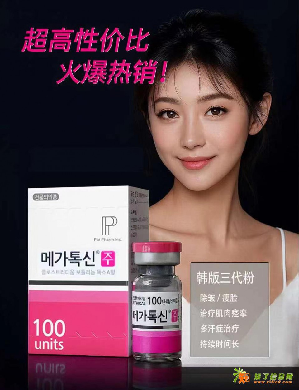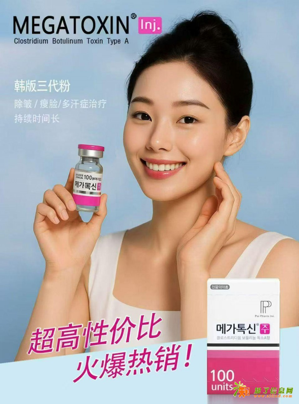 韩国Meditoxin粉肉 认准正品 特点:见效迅速,是瘦脸,面部除皱的首选,性价比最高。 韩国粉肉,作为完全依靠韩国国内技术生产的这一产品与BOTOX有同样的效果,都使用于除皱及改善皮肤皱纹,在韩国市场占有率位居第一,同时也向国外出口。