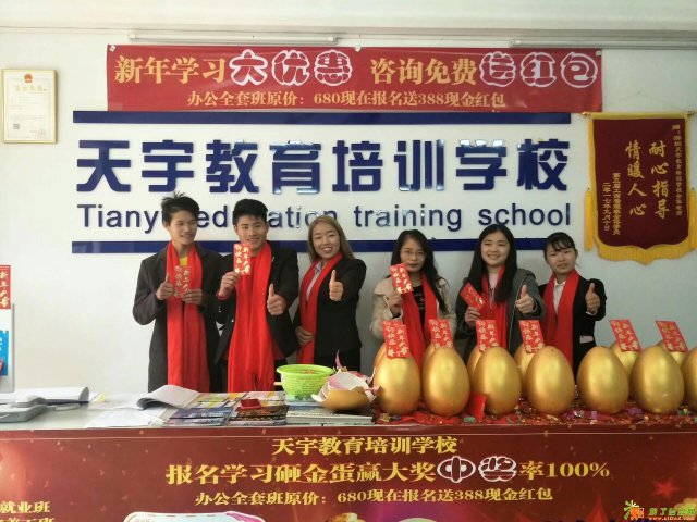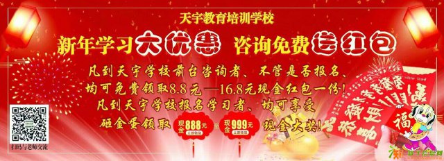 凡到天宇学校前台咨询者,不管是否报名,均可免费领取8.8----16.8元现金红包一份!凡到天宇学校报名学习者,均可享受砸金蛋领取现金888元----999元现金大奖!