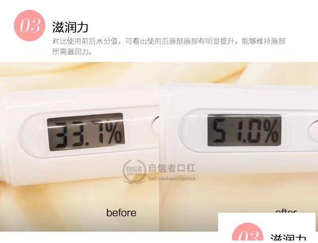 总结:在以上测试中,自信者淡彩晶钻唇膏都有很不错的表现,难怪我的小伙伴会安利给我。既有滋润嘴唇改善唇纹的功效,又有千人千色的上色效果,涂在嘴上立即让嘴唇看起来水嘟嘟,同时成分安全天然,让人用起来非常放心;优秀的持久度,再也不用担心脱色沾杯的尴尬。还有大气时尚的外观也相当拿得出手。自信者淡彩晶钻唇膏已经成为楼主包包必备口红了,我觉得这个草还是可以拔的,你们看完怎么样?