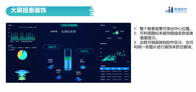其次,需要确定大屏数据可视化分析报表的颜色搭配,是要配合公司logo、颜色基调进行设计,还是使用常规的颜色搭配,以及考虑如何进行打大屏数据可视分析报表的装饰,既能凸显报表重点又完美与公司 网基调等融合。