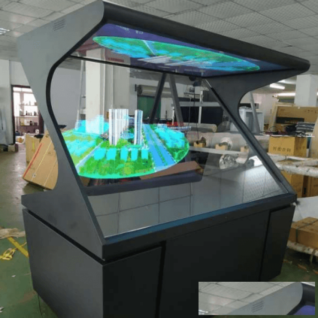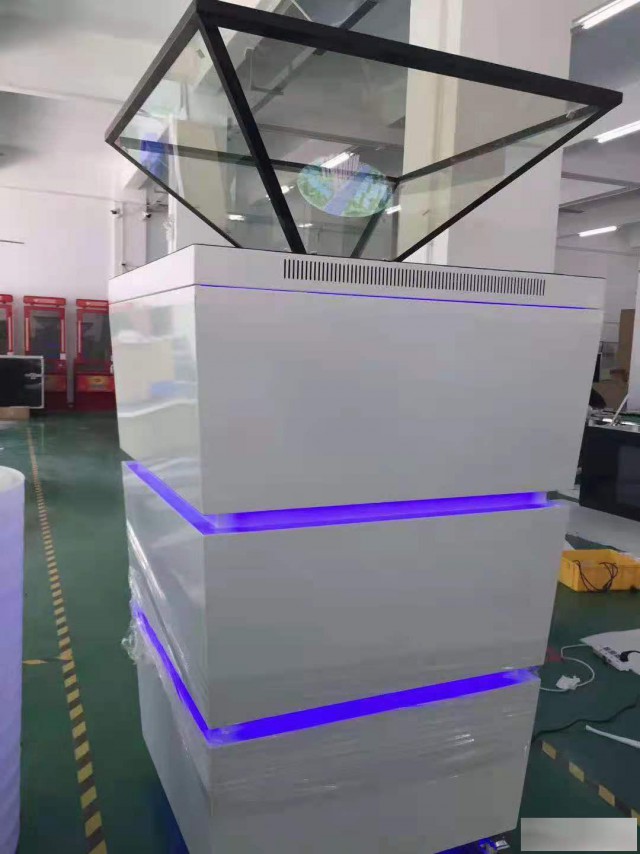 柜体时尚美观,有科技感;顶部四面透明,真正的空间成像;色彩鲜艳,对比度,清晰度高;有空间感,感,形成空中幻象;中间可结合实物,实现影像与实物的结合;也可配加触摸屏实现与观众的互动;