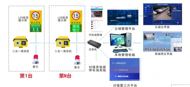 园区内部道路测速系统主要能实现的功能:测出自己车辆的车速、识别出自己的车牌号码,把速度值和车牌号显示到LED屏上,超速红字显示,未超速绿字显示,管理平台记录所有信息。目的是提醒司机自己减速慢行!此类雷达测速设备不是电子警察,仅做管理提醒,不能用于交警平台做处罚使用!