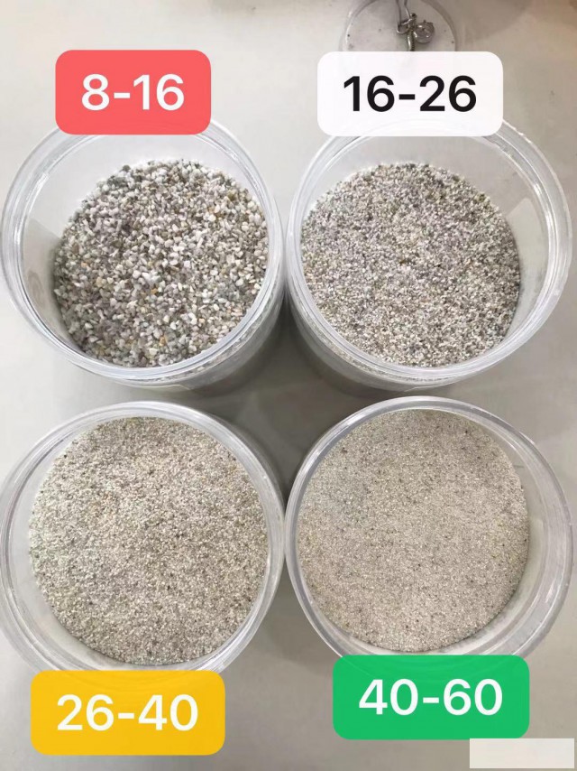 石英砂常用规格有:0.5-1mm、1-2mm、2-4mm、4-8mm、8-16mm、16-32mm、10-20目、20-40目、40-80目、100-120目。