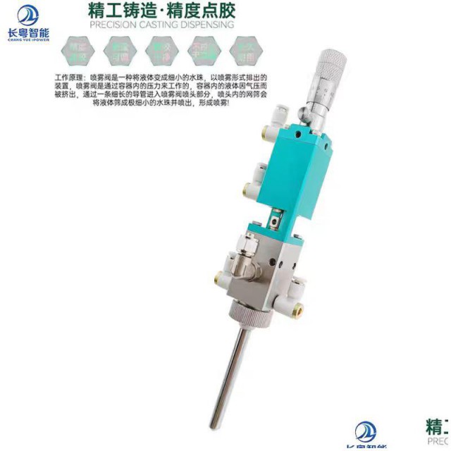 CY3613型精细小雾化喷雾阀属于液体与气体混合型喷雾阀,采用双向气动开、关阀,精密控制涂覆量,内部分流与导流结构,特殊的流体密封结构,减少了更换密封圈的频率,具有寿命长、维护快捷等特点。适合喷新途径多种液态流体,如:丙烯酸类、硅类、UV胶等表面涂覆材料。是表面涂覆的阀。