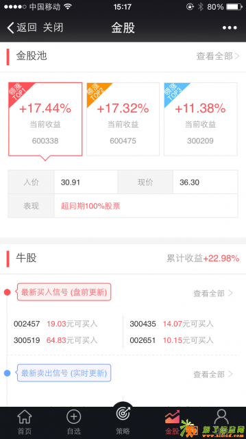 使用方法3、在首页里可以自由输入自己需要购买的股票代码或拼音或名称创建策略,也可以查看每天的金股推荐或者最优策略创建策略;