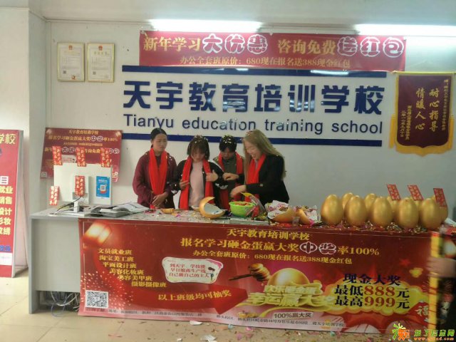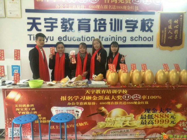凡到天宇学校前台咨询者,不管是否报名,均可免费领取8.8----16.8元现金红包一份!凡到天宇学校报名学习者,均可享受砸金蛋领取现金888元----999元现金大奖!