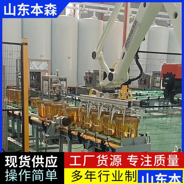 桶装润滑油关节码垛机采用多轴联动机械臂结构,模拟人类手臂的灵活运动轨迹,可适应不同高度、层数及排列方式的码垛需求。其末端执行器通常配备可调节夹具或真空吸盘,兼容多种规格的润滑油桶(如5L、20L、200L等),并通过高精度传感器实时监测油桶位置与姿态,确保抓取稳定性。设备支持与输送线、称重机、封箱机等设备联动,形成完整的自动化生产线。