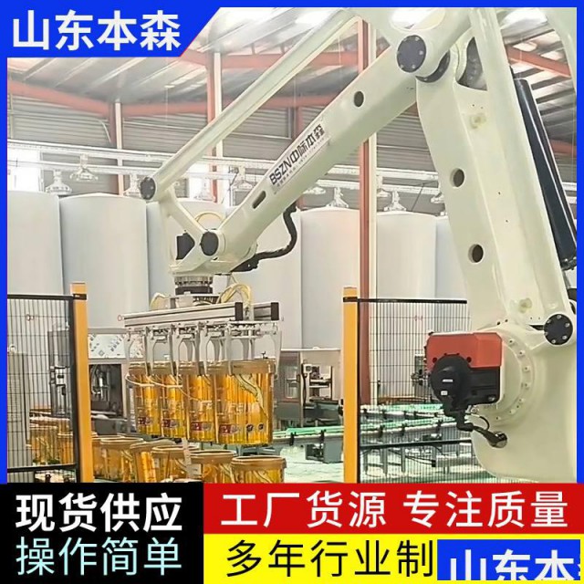 桶装润滑油码垛关节机械手主要由机械臂、控制系统、抓取装置(如夹爪或吸盘)和传感器组成。机械臂采用多关节设计,可模拟人类手臂的灵活运动,适应不同规格润滑油桶的搬运需求。传感器实时检测油桶的位置、尺寸及周围环境信息,确保抓取与码垛的精准性。控制系统作为“大脑”,负责接收指令、处理信息并发出控制信号,精确规划机械臂的运动轨迹和操作流程。