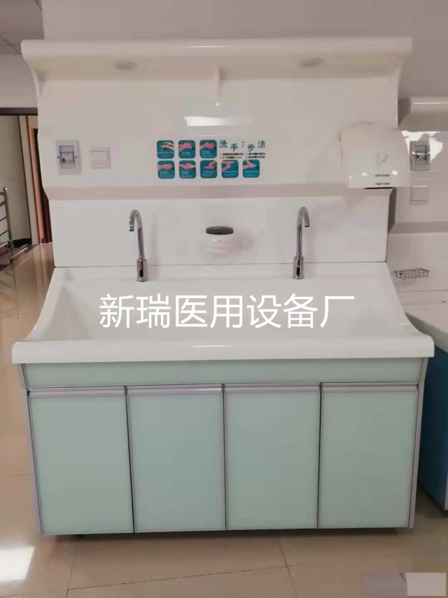 高分子洗手池材质特点:采用高分子材料一次吸塑成型,出水方式有:感应式、膝控式、脚踏式和手动开关,一台洗手池可客户要求选择单一出水方式或多种出水方式。洗手池分高背和低背,高背总高度1800mm,配有美容镜,照明灯,皂液器,可按客户要求配置烘手器和热水器。低背板无配置。