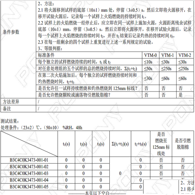 阻燃标准等级:UL94VTM-0参考标准UL94《器具和设备用塑料材料的可燃性试验》