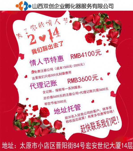 山西双创企业孵化器服务有限公司,情人节特惠4100元。