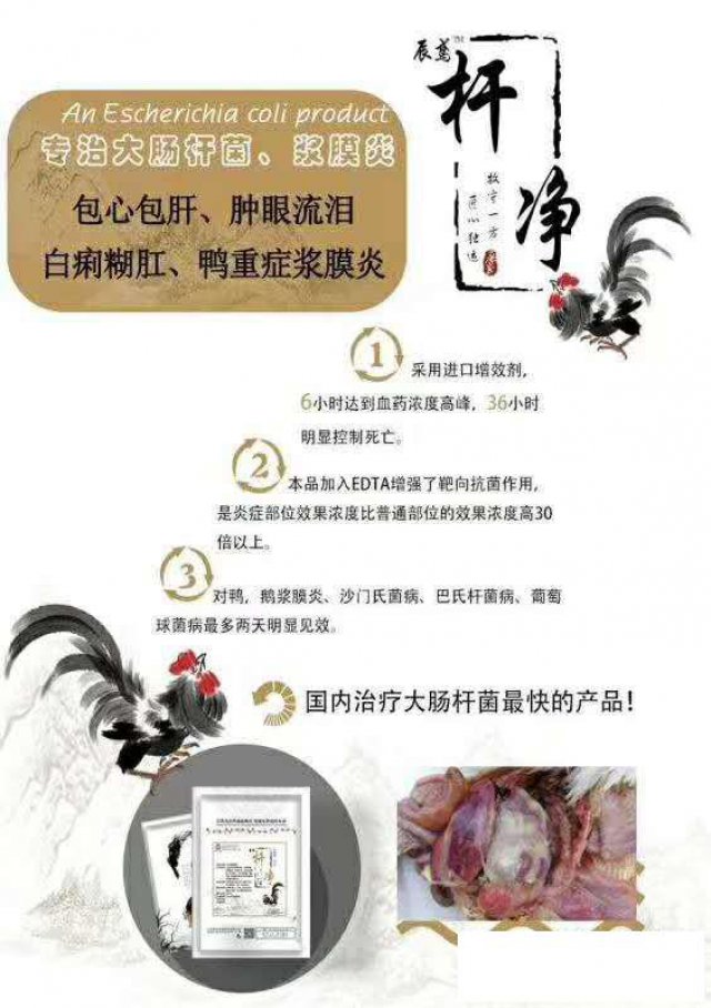 1:工艺独特,全新精制而成,是治疗禽大肠杆菌,沙门氏菌,浆膜炎,脾坏死的高效、广谱复方高效产品