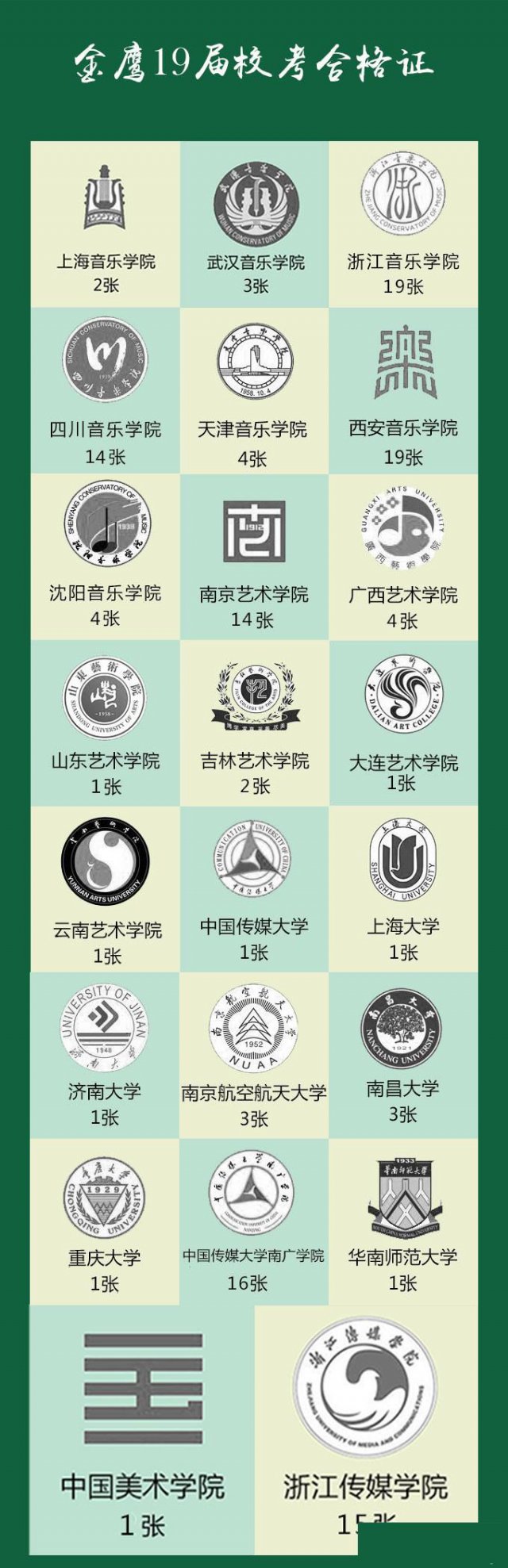 学员王婷玉是黑龙江佳木斯艺考生,18年4月开始参加金鹰长训班,现已取得武汉音乐学院音乐编辑与制作专业全国第13名,南京艺术学院录音艺术外省第10名,中国传媒大学作曲专业全国第37名。学员章方博是湖北襄阳艺考生,18年7月开始参加金鹰长训班,现已摘到武汉音乐学院音教专业第359名,浙江音乐学院作曲专业全国第41名,南京艺术学院作曲外省第14名,南京艺术学院录音艺术外省第12名。学员陈鸿笙是17年7月开始参加金鹰长训班,是金鹰的复读学员。第一年艺考斩获浙江音乐学院越剧伴奏专业入围,西安音乐学院音乐表演专业入围,广西音乐学院音乐表演专业第2名。今年再战心仪院校——武汉音乐学院音乐表演专业全国26名已经成功入围。杭州金鹰艺术专修学校师资怎么样?