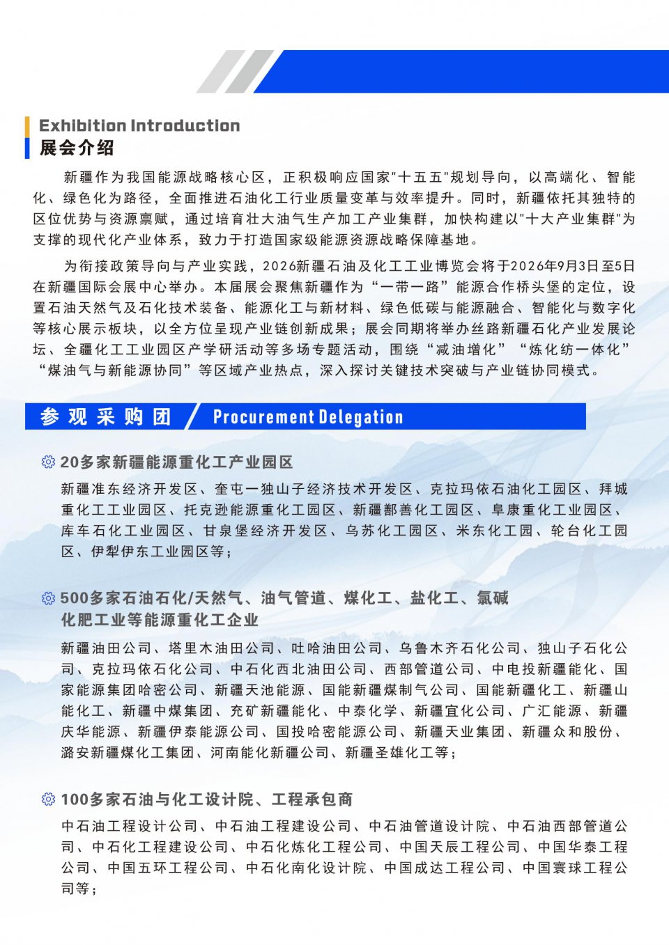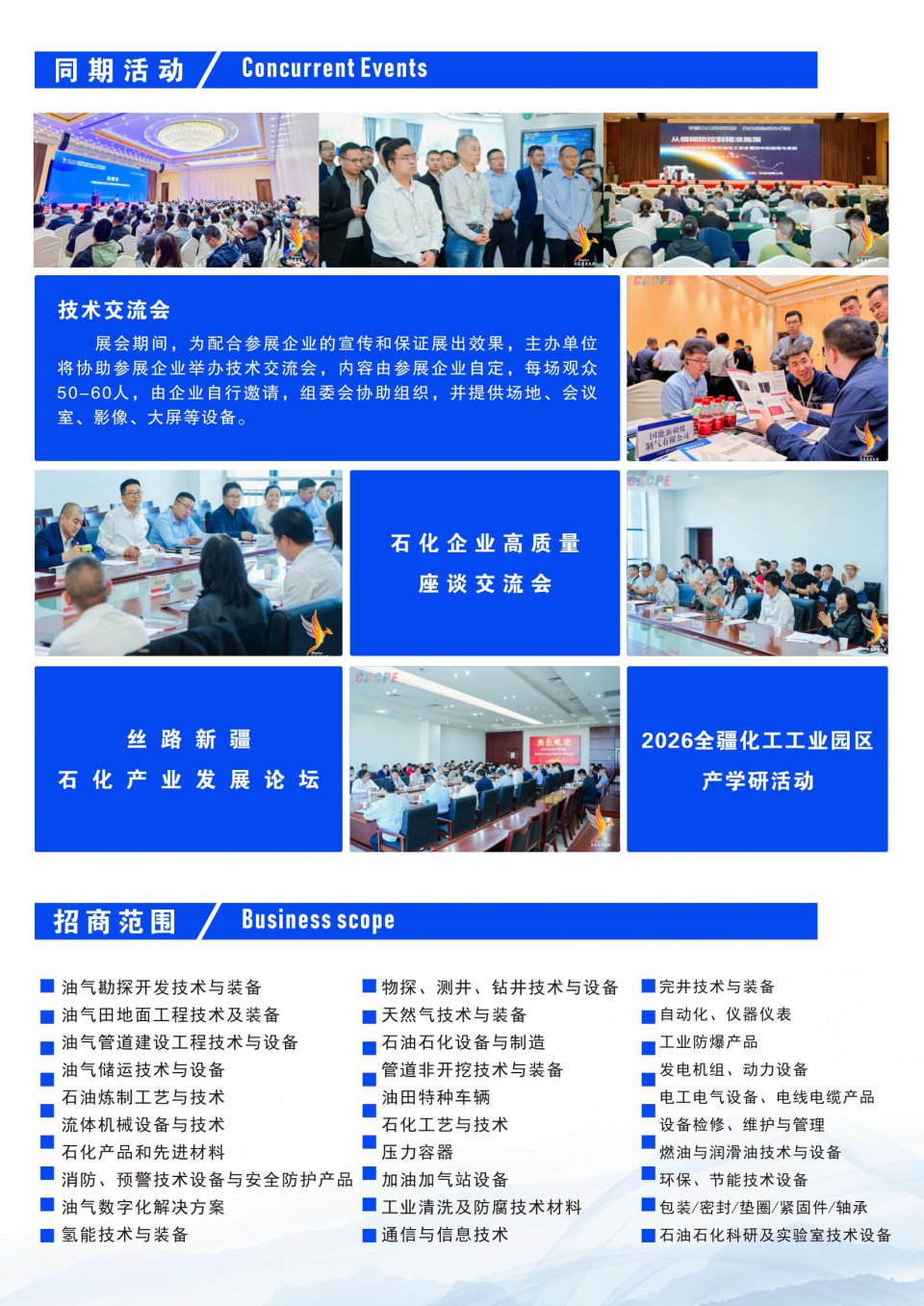 展示范围:石油化工、煤化工、精细化工、化工工程、安全防护与应急消防、环保节能水处理、化学品包装与储运、自动化及仪器仪表、防爆电气、泵阀管道、工业数智化等。