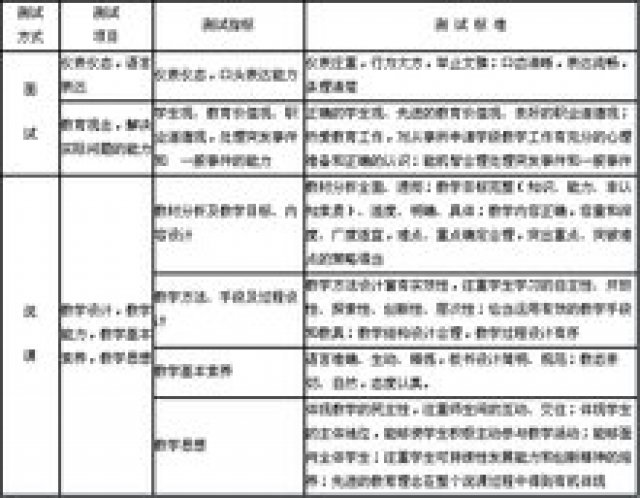 主要考核申请人从事教师职业所应具备的教育理念、职业道德和教育法律法规知识;科学文化素养和阅读理解、语言表达、逻辑推理和信息处理等基本能力;教育教学、学生指导和班级管理的基本知识;拟任教学科(专业)领域的基本知识,教学设计、实施、评价的知识和方法,运用所学知识分析和解决教育教学实际问题的能力。