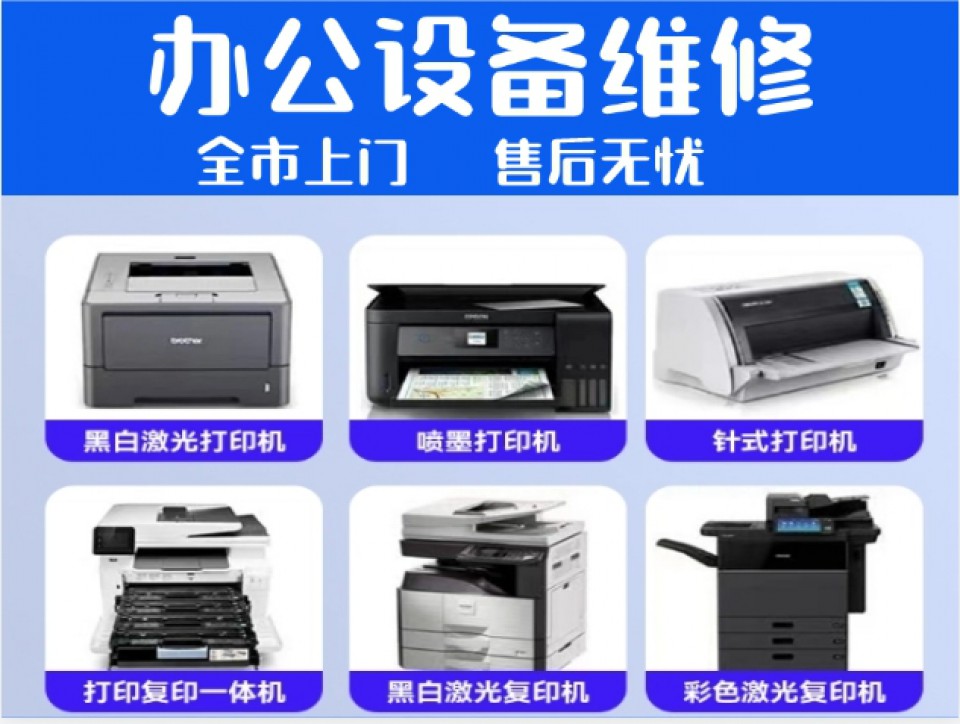 1、办公设备维修:专业维修各种品牌复印机、打印机、传真机、一体机,电脑、投影仪、考勤机、绘图仪等办公设备。