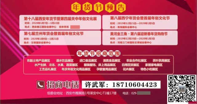 2020第十八届西安年货会时间:2020年1月7日—1月22日 地点:西安曲江会展中心、陕西省体育场、西安家世界博览中心 邀 请 函 主办单位:中国商业联合会、陕西省商务厅、西安市商务局 承办单位:西安旭峰丝路会展有限公司 一、前言 西安年货会是以继承和发扬中华民族优秀传统文化为办展宗旨,以丰富春节商品市场供应、满足市民年货采购需求为办展目标,通过展示展演我国传统年庆风俗文化、展示展销省内外各地名优商品,来促进相关行业共同和谐发展,是西安市人民政府重点打造的“西安年”系列活动之一,得到了省市相关部门的大力支持,满足了相关参展企业和消费者不同的假日消费需求。 本届年货会将继续以“继承和发扬中华民族优秀传统文化”和“扩大内需、促进消费、惠及民生”为宗旨目标,不断改革创新,将更加注重百姓物质文化需求、注重参展企业利益、注重展会品牌价值,通过丰富多彩的年庆文化活动、暖心周到的展会服务,把年货会办成集“展示交流、洽谈销售、文化娱乐”为一体的“一站式”全国性知名的年庆平台,为继承和发扬中华民族优秀传统年文化做出积极的贡献。 二、参展范围(具体展区划分请致电组委会) 1、酒水、食品、饮料、进口食品、休闲食品、绿色食品、茶叶茶具、地方农产品、土特产、清真食品、水果、蔬菜、水产生鲜、冷冻产品、年宵花卉、 2、服装服饰、床上用品、鞋子箱包 3、礼品工艺品、年庆年俗文化用品、孕婴童用品、儿童玩具书刊、家居家电、日用百货等; 4、关中民俗展及各地特色小吃展区 三、展位收费标准(详见展位图) 四、广告类收费标准 印刷品:参展证(90×110㎜)10000元/全包; 宣传门票(210×95mm)1万元/5万张; 现场广告:广告位(详见效果图)由组委会统一安排,画面设计由参展商提供。 五、参展程序 1、组委会安排展位,填写《参展申请表》加盖公章或签字后与公司营业执照一并邮寄或传真至组委会,并在三个工作日内将费用汇至组委会指定账号,从而确定参展资格; 2、展位、广告等由组委会根据“先申请、先付款、先安排”,冠名/协办赞助单位优先原则统一安排,为确保会场整体效果,组委会保留调整的权利。 六、展会优势 政府支持 西安年货会是商务部支持的陕籍唯一一个节庆促销活动,是省市政府相关部门重点培育的大型节庆消费类展会项目。 重磅宣传 组委会投入巨资,在电视、报纸、广播、网络等进行全方位、立体化、密集的宣传报道。 七、展会活动及特色服务 1、猜灯谜送祝福活动; 2、特色年货产品推介会; 3、旭峰VIP会员特价商品团购活动; 4、大型团购:组委会专门成立团购部,接待集团客户年货采购,服务广大参展企业; 5、小件寄存处:在各展馆设小件物品寄存处,解决市民携带不便,方便市民参会逛会; 6、“寄年货、寄爱心”活动:会场特设“即购即邮”速递业务,为顾客提供邮寄年货便民服务,既解决了市民携带和邮寄不便,也为展商提供了一个打开全国销售及宣传的良好渠道。