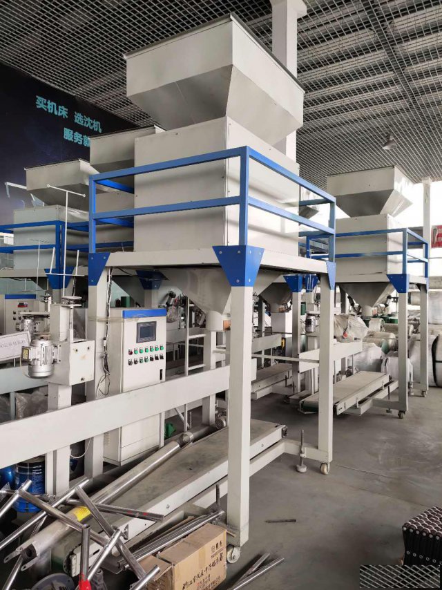 此时包装袋套在自动夹袋器上,通过程序控制,称量斗的卸料门自动打开,物料流入到包装袋中,完毕后后自动松开夹袋装置,包装袋自动落下到输送机上,并被输送到自动热合或者自动缝包工位。人工套上另一个包装袋后,双速给料、自动称重、自动下料循环往复进行。