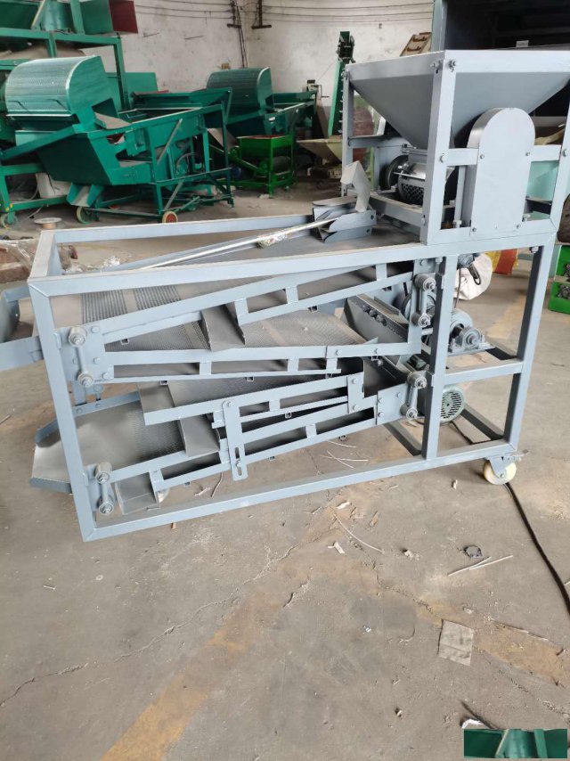 本机上下筛由主轴偏心轮驱动做平面振动,把由料斗进行脱粒处理后得花椒进行筛选,由上下筛配合运动,对花椒进行分级去杂处理,经处理花椒由上筛筛出,其余花椒由下筛筛出,其中椒杆、椒叶尘土等有下筛筛出,椒籽和小椒通过下筛筛出后经过风机进一步风选分离,使筛净率大大提高