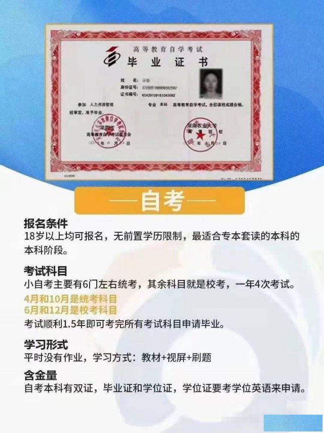 优点:第一,我们普遍认为自考含金量是成人学历提升里面最高的;第二,自考时间灵活,可控,考得快拿证也比较快(四川省有小自考,小自考难度较低,最快1.5年毕业)