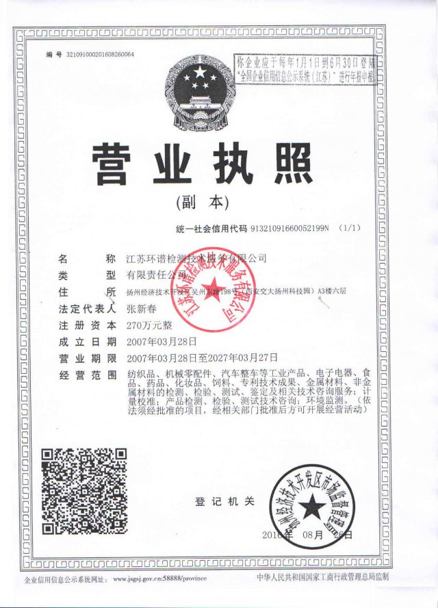 江苏环谱质检是专业第三方检测机构,提供纺织品、婴童、玩具、电子电器、可靠性、食品及食品接触材料,汽车材料的质检。