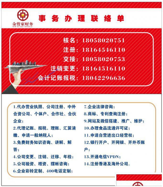 舟山市金管家财务管理有限公司是一家经舟山市工商局注册登记、批准, 持有《企业法人营业执照》,同时持有财政局审批的《代理记账许可证》能依法独立承办工商注册、代理记帐、会计工作等业务的服务机构。公司成立将近7年,有专业的业务销售人员,工商人员,会计税务师,提供专业的快速办理注册公司,变工,注销等企业一站式服务,还有工商局颁发的《守合同重信用》证书。公司成立时间长,成立了税务师事务所,配有专业的税务师,会计师,客户整个注册、记账都是同一家公司,可以为客户提供更好的服务。