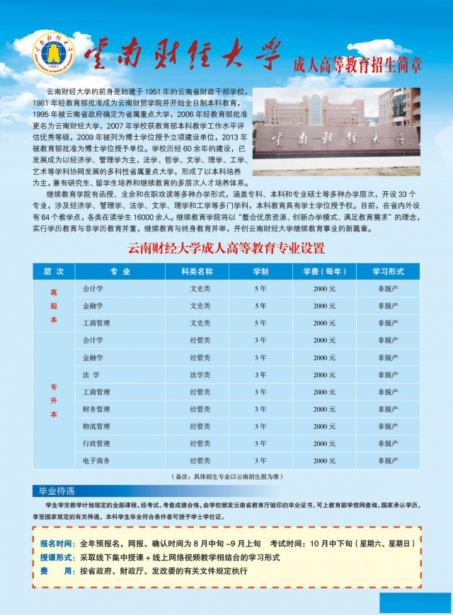 可报读学校有:云南开放大学,云南民族大学,西南林业大学、西北大学、湖南工业大学、大理大学、云南中医药大学、云南经济管理学院,红河学院、楚雄师范学院、昆明学院等。
