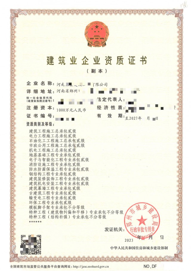 2.郑州:建筑二+市政二+电力二+石油二+机电总包二+机电安装二+输变电二+消防二+装修二+地基基础二+钢结构二+防水二+幕墙二+环保二+模板+特种起重吊装+安许已上报