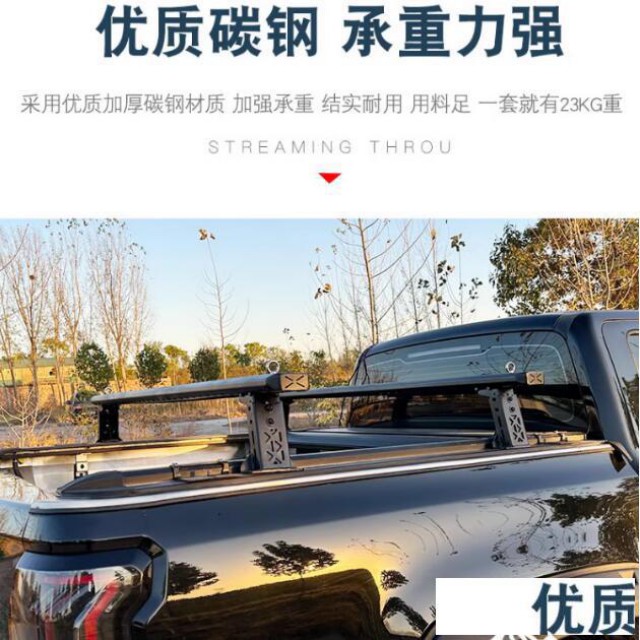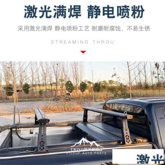 江铃大道皮卡车卷帘行李横杆改装件,加厚碳钢材质制成,加强承重,结实耐用。采用激光满焊,静电喷粉工艺,耐磨耐腐蚀,不易生锈。原车没有货箱宝的可以使用免孔支架固定,有卷帘的理由卷了支架固定。预留有拓展孔位,可加装行李平台,行李箱,露营睡帐等。