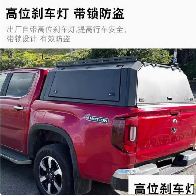 24款大众amarok皮卡车分体三开门高盖后箱盖,锰钢材质,有全封闭,前后玻璃款式可选。电泳防锈处理,出厂自带高位刹车灯,提高行车安全。双侧采用液压撑杆,开合方便。免打孔安装,带锁防盗。
