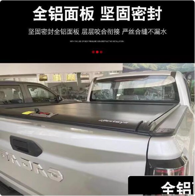 江铃大道皮卡车手动卷帘后盖平盖子改装件,加厚铝合金材质制成,承重力强。耐磨耐腐蚀,重量轻。升级款滑轨,宽边覆盖设计,安装稳固不移动。带锁设计,内置LED灯珠照明。坚固密封全铝面板,严丝合缝不漏水。