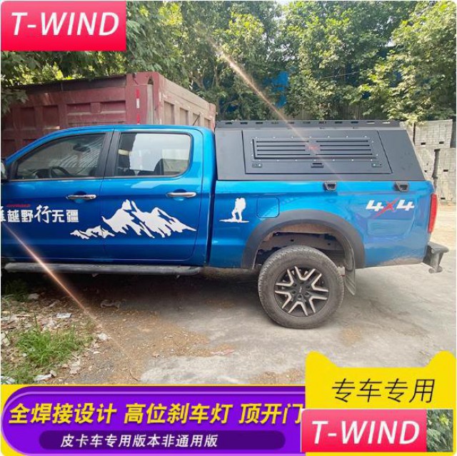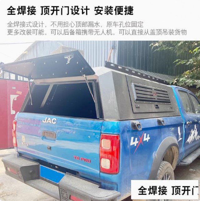 江淮帅铃T6/T8悍途皮卡车三开门后箱盖子改装件,全封闭全焊接,全金属材质,可维护性好。后盖出厂带高位刹车灯,提高行车安全。全焊接式设计,不用担心顶部漏水,免打孔安装,卡扣固定。三开门(尾门,两侧)均可打开,带有液压撑杆更加方便省力。带锁设计,安全放心。