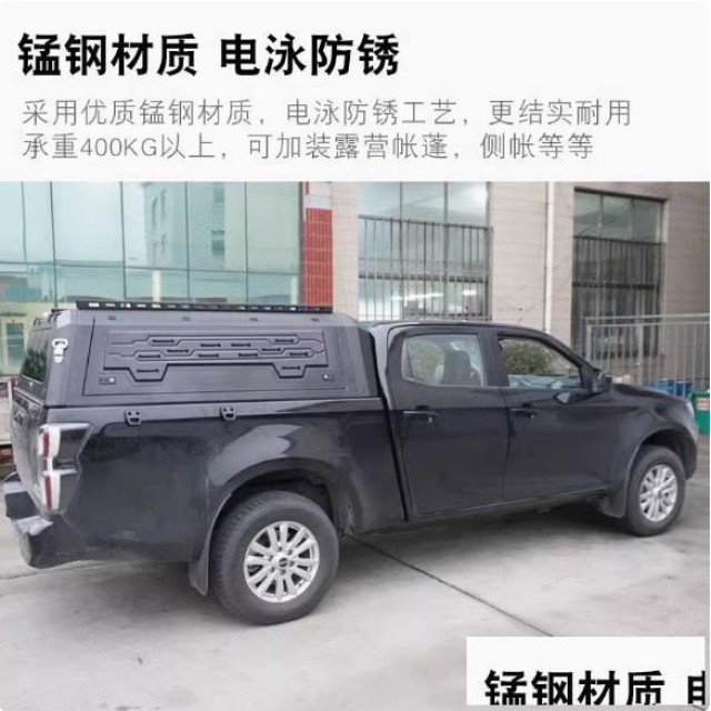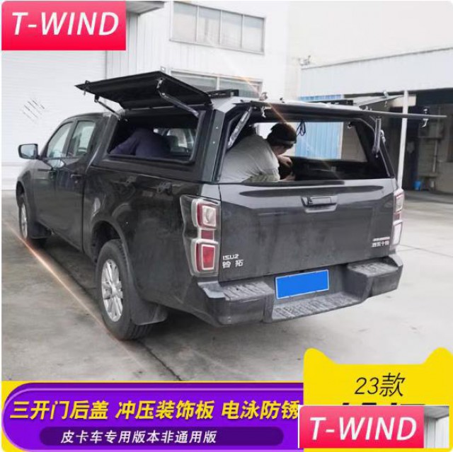 江西五十铃铃拓皮卡车三开门后箱高盖改装件,全金属材质,遮阳挡雨,结实耐用。带高位刹车灯,提高行车安全,一侧带脚蹬,可登盖顶。带有液压升降窗盖,开合灵敏。免打孔安装,卡扣固定,方便快捷,三侧带锁,安全放心。