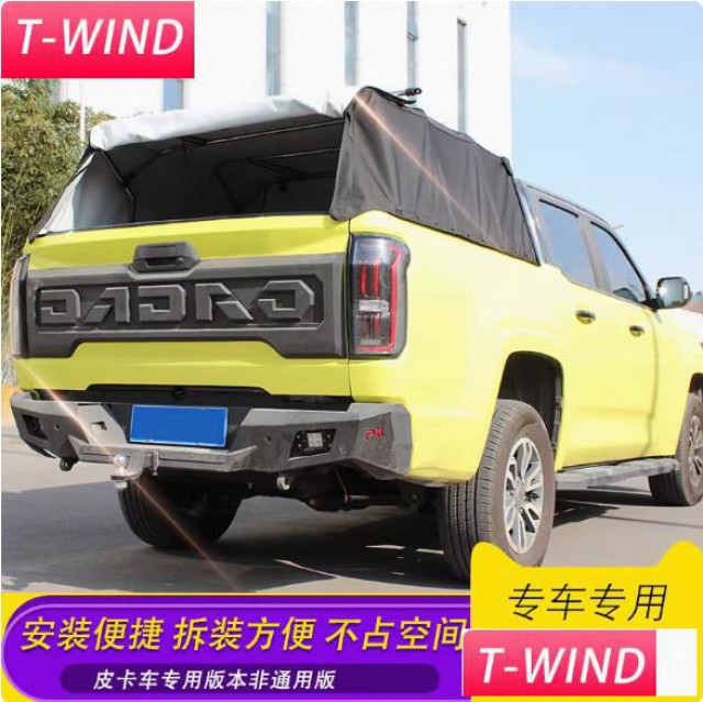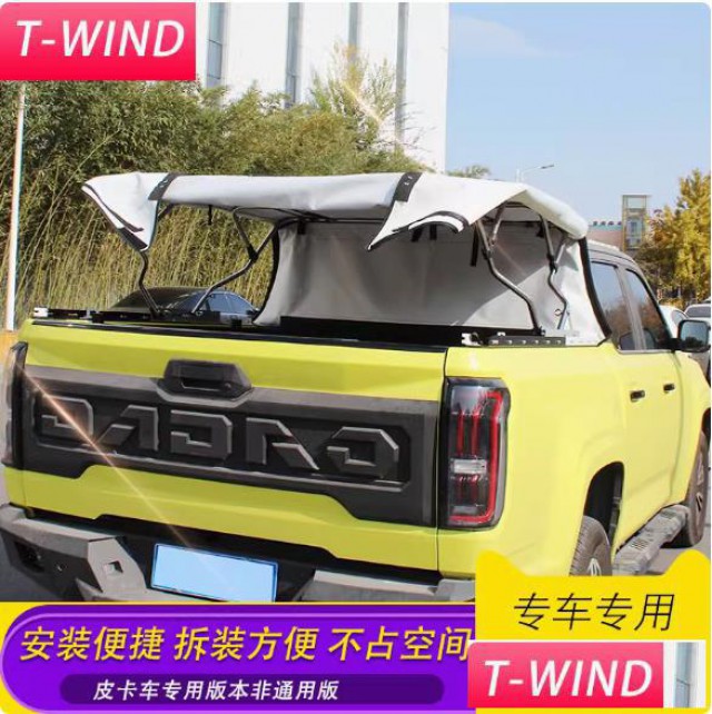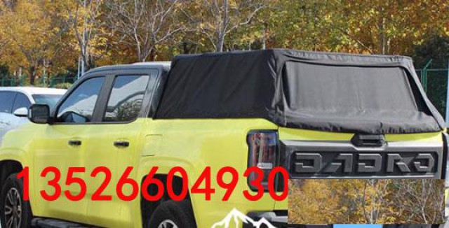 江铃大道长城炮皮卡车后箱盖车厢货箱改装软蓬布,篷布是牛津布复合布材质,蓬顶支架采用不锈钢材质制成。固定夹扣采用铝合金材质,坚固耐用。软高盖不用时,可折叠。带有魔术贴,拉链进行密闭加固,拆装方便。