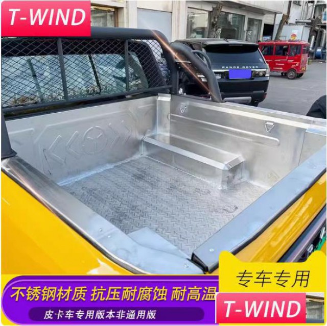 雷达RD6皮卡车不锈钢后箱宝尾箱防磨垫改装件,不锈钢201/304材质,高温不变形,抗压耐腐蚀不易生锈,有效保护新车漆面。采用满焊工艺,美观防水。原车开模,贴合车身,自带绑绳挂钩,方便实用。