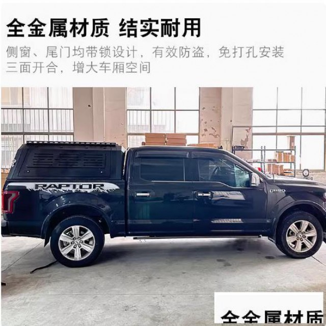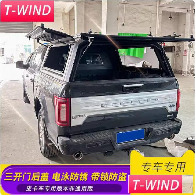 塔库玛TACOMA皮卡车后箱尾箱货箱高盖改装件,优质锰钢材质,三开门设计,尾门及两侧可打开,均带有液压撑杆,便于开启闭合,均带锁。采用电泳防锈工艺,结实耐用。带脚蹬,可登盖顶,带高位刹车灯。安装免打孔,不伤车身,方便快捷。