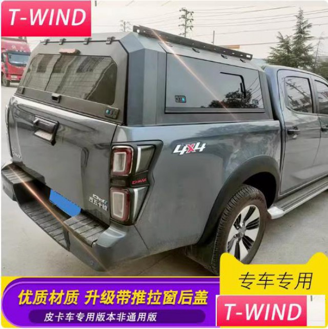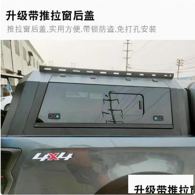 21款江西五十铃dmax皮卡车三开门推拉窗款后箱盖,窗户带有推拉窗。全金属材质,结实耐用。液压升降窗盖,侧窗,尾门均带锁设计,有效防盗。免打孔安装,卡扣固定。后盖均采用双侧液压撑杆,方便省力。