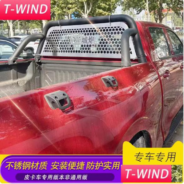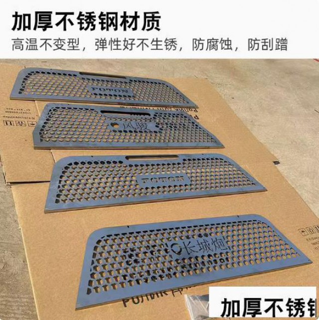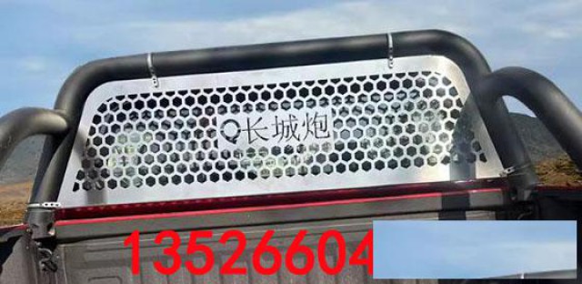 长城金刚炮凯程f70铃拓DMAX皮卡驾驶后窗防护网改装件,不锈钢材质,高温不变形,不生锈。整块板子冲孔而成,一体工艺激光镂空。绑带固定,无损安装。保护后玻璃的同时增加美观度,原车数据开模,贴合度高。防护驾驶室玻璃,提升颜值。