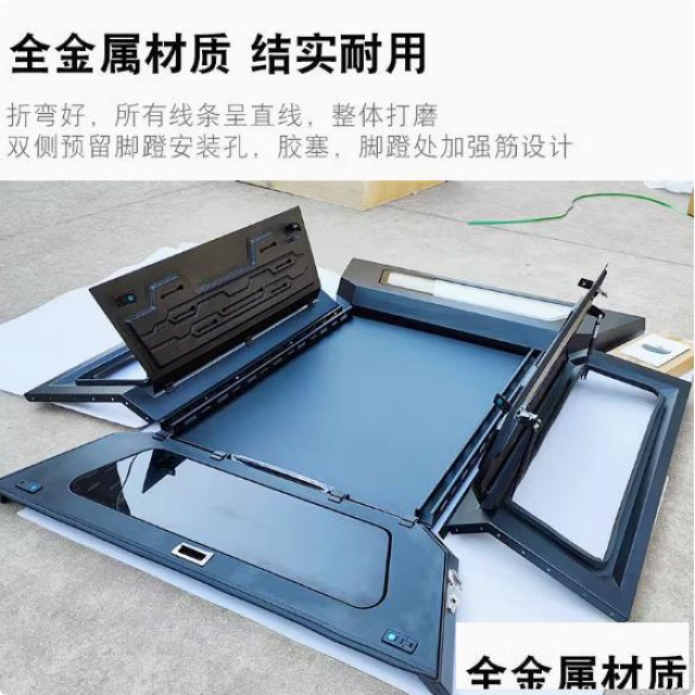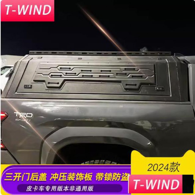 24年新款塔库马TACOMA皮卡车后箱尾箱货箱高盖改装件,加长标箱款后盖,全金属材质,三开门设计,均带有液压撑杆,便于开启闭合。全冲压装饰板,结实耐用。带脚蹬,可登盖顶,带高位刹车灯。带锁防盗,安装免打孔,不伤车身,方便快捷。