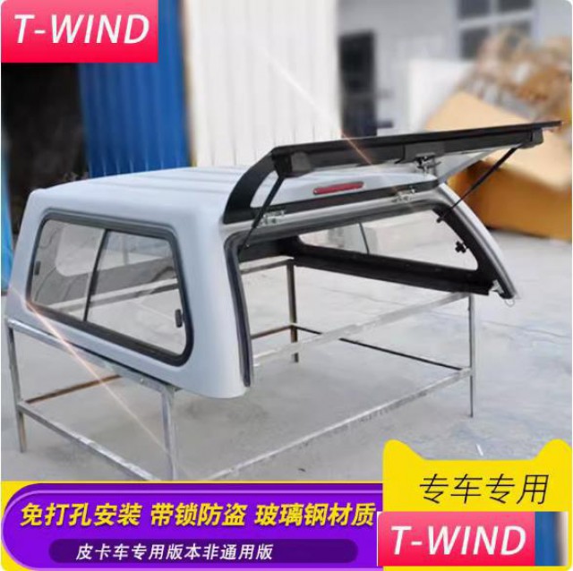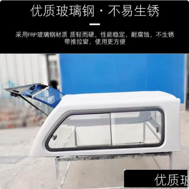 hilux海拉克斯皮卡车玻璃推拉窗平顶高盖改装件,玻璃钢材质,质轻而硬,性能稳定。耐腐蚀,不生锈。带推拉窗,便于通风。带高位刹车灯,提高行车安全。双侧液压撑杆,方便省力。免打孔安装,方便安全。