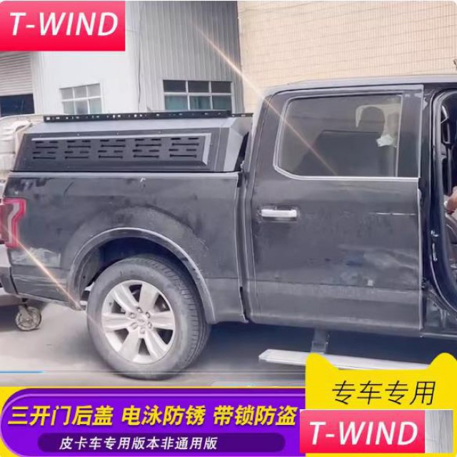 福特猛禽f150皮卡车后箱货箱盖子改装件,半高款式,盖子总高度是30cm。三开门设计,采用电泳防锈工艺,结实耐用。一侧带脚蹬,可登盖顶,带有高位刹车灯,提高行车安全。免打孔安装,带锁防盗,安全有保障。