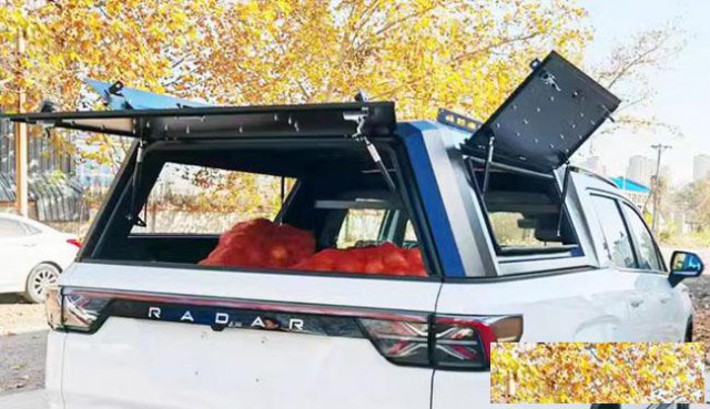 雷达RD6皮卡车整体三开门高盖后箱尾箱盖,锰钢材质,全封闭款式,整体打磨,结实耐用。原车数据开模,贴合车身。带液压升降窗盖,快速开合。带高位刹车灯,提高行车安全。卡扣安装,免打孔。带锁设计,有效防盗。